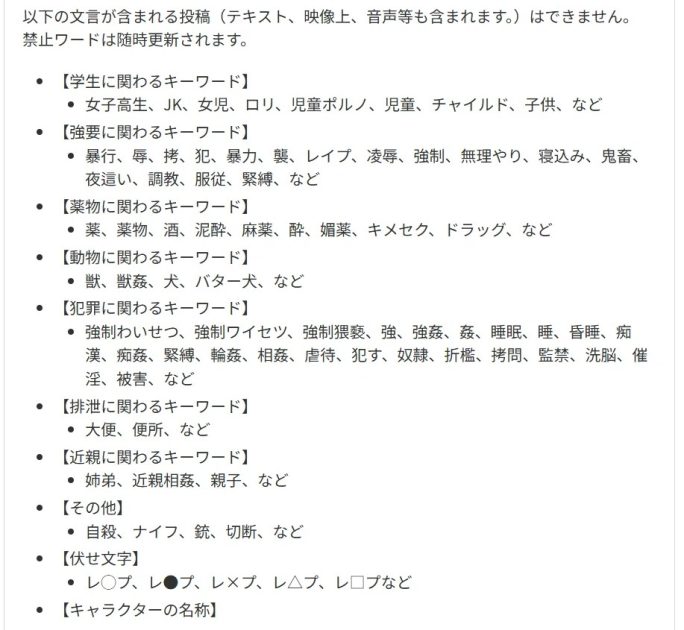 こちらの画像は他プラットホームの利用規約になりますが、ある程度禁止ワードに付いては教えてくれてます。